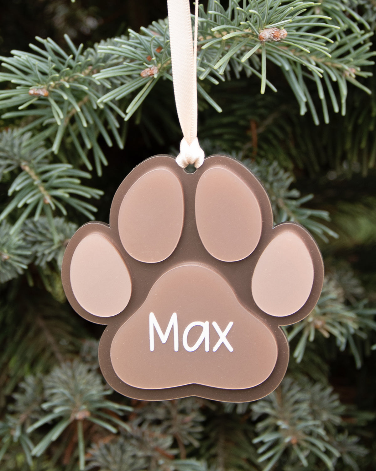 Akrilni ukras Šapica sadrži izrezano ime vašeg kućnog ljubimca, a savršen je kao ukras za božićno drvce.