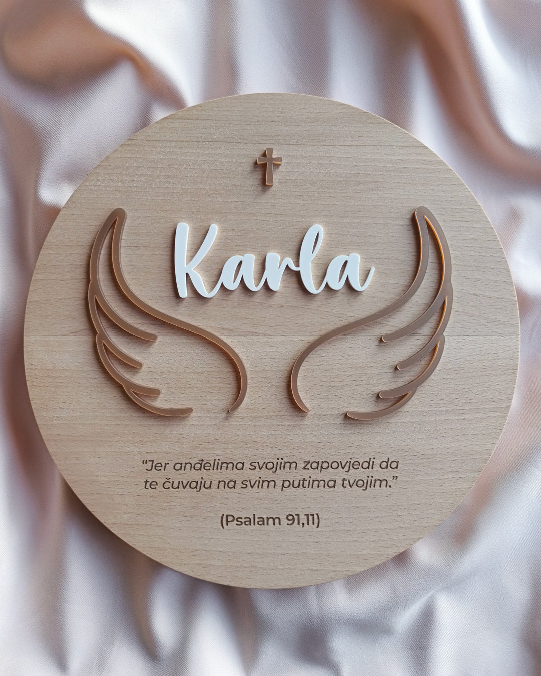 Personalizirani krug od punog bukovog drva s krilima i imenom djeteta savršen je kao dekoracija ili poklon za svete sakramente.
