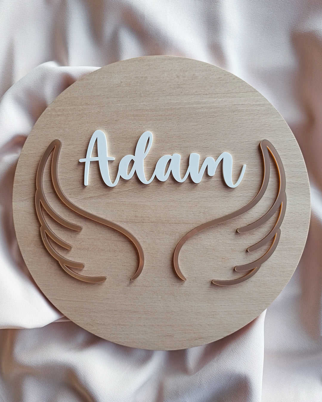 Personalizirani krug od punog bukovog drva s krilima i imenom djeteta savršen je kao dekoracija ili poklon za svete sakramente.