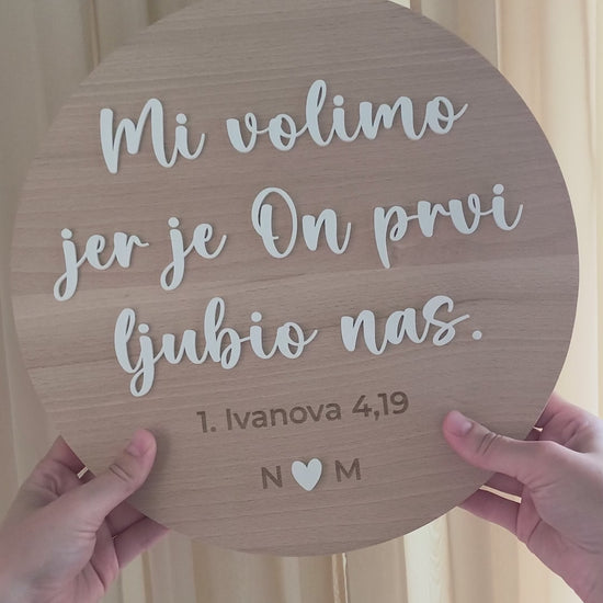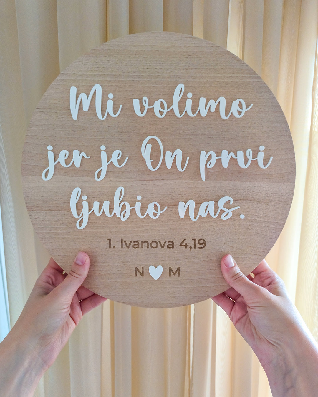 Drveni krug promjera 30 cm izrađen od punog bukovog drva debljine oko 1,7 cm. Na prednjoj strani kombinirani su bijeli pleksiglas natpis i gravirana slova.