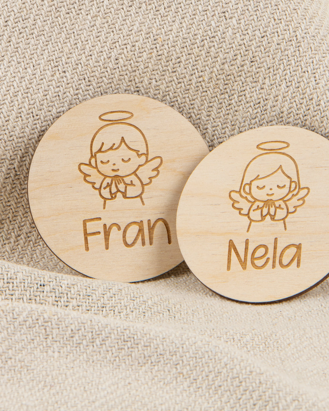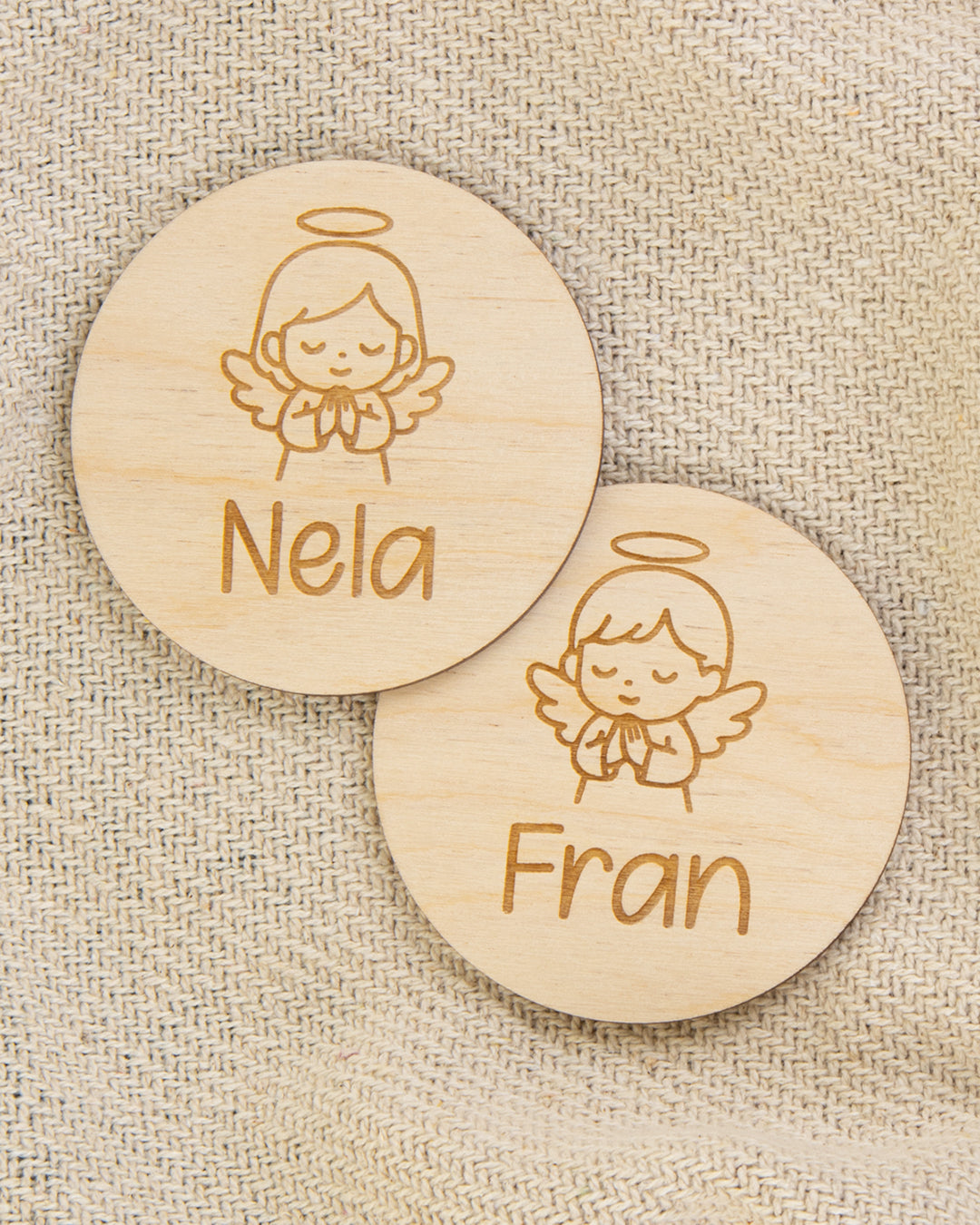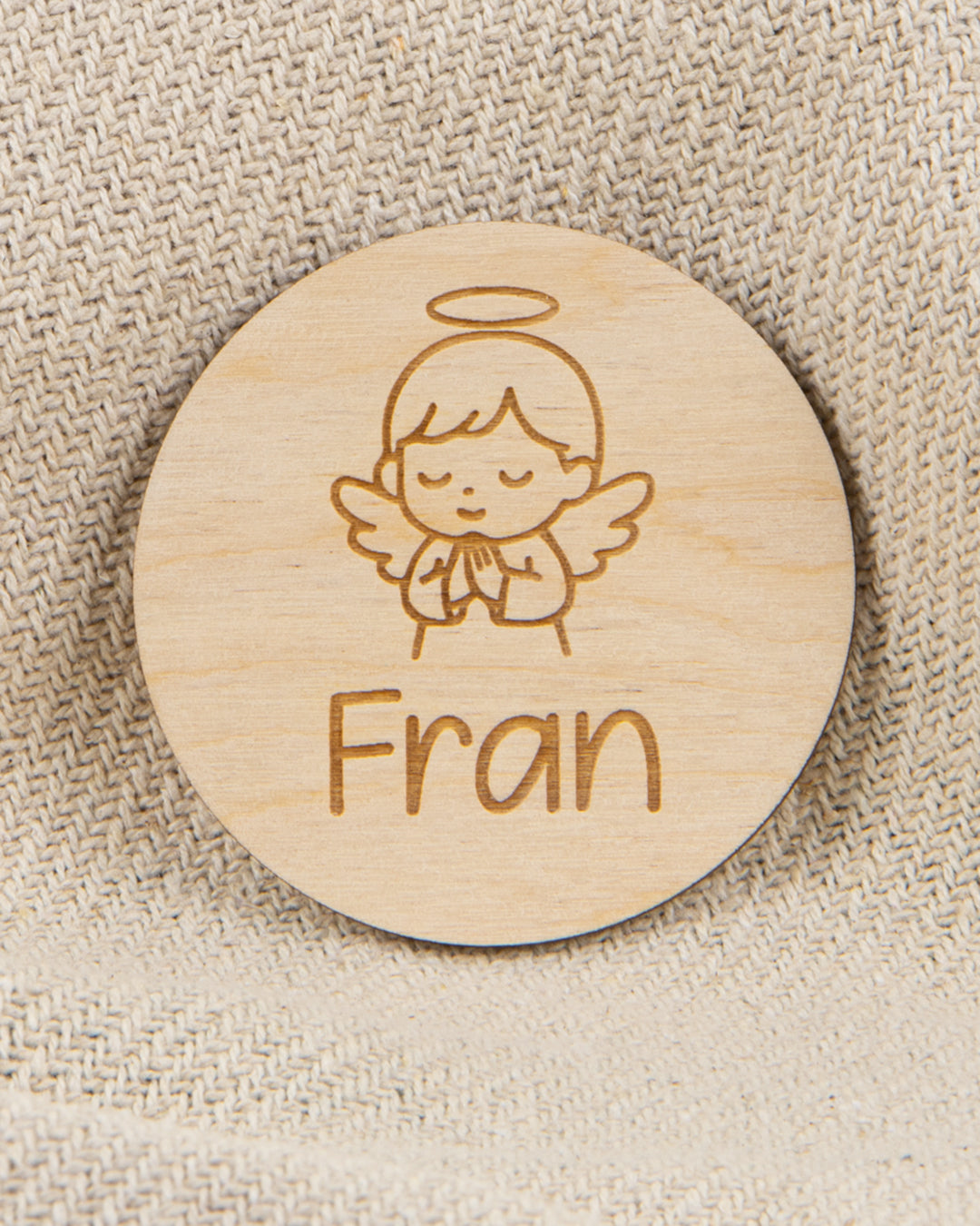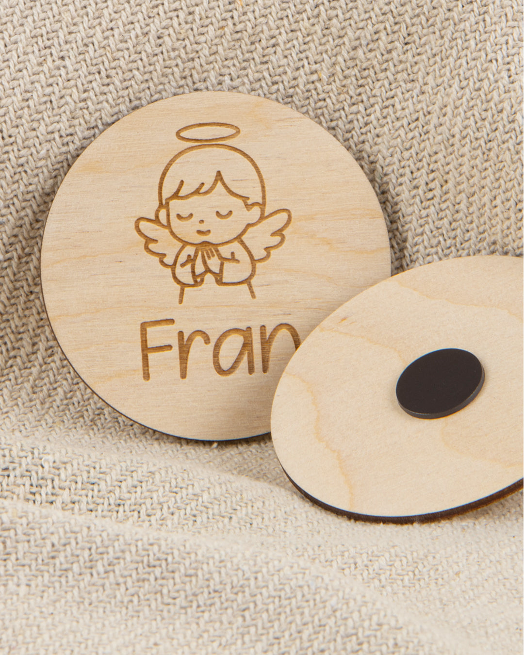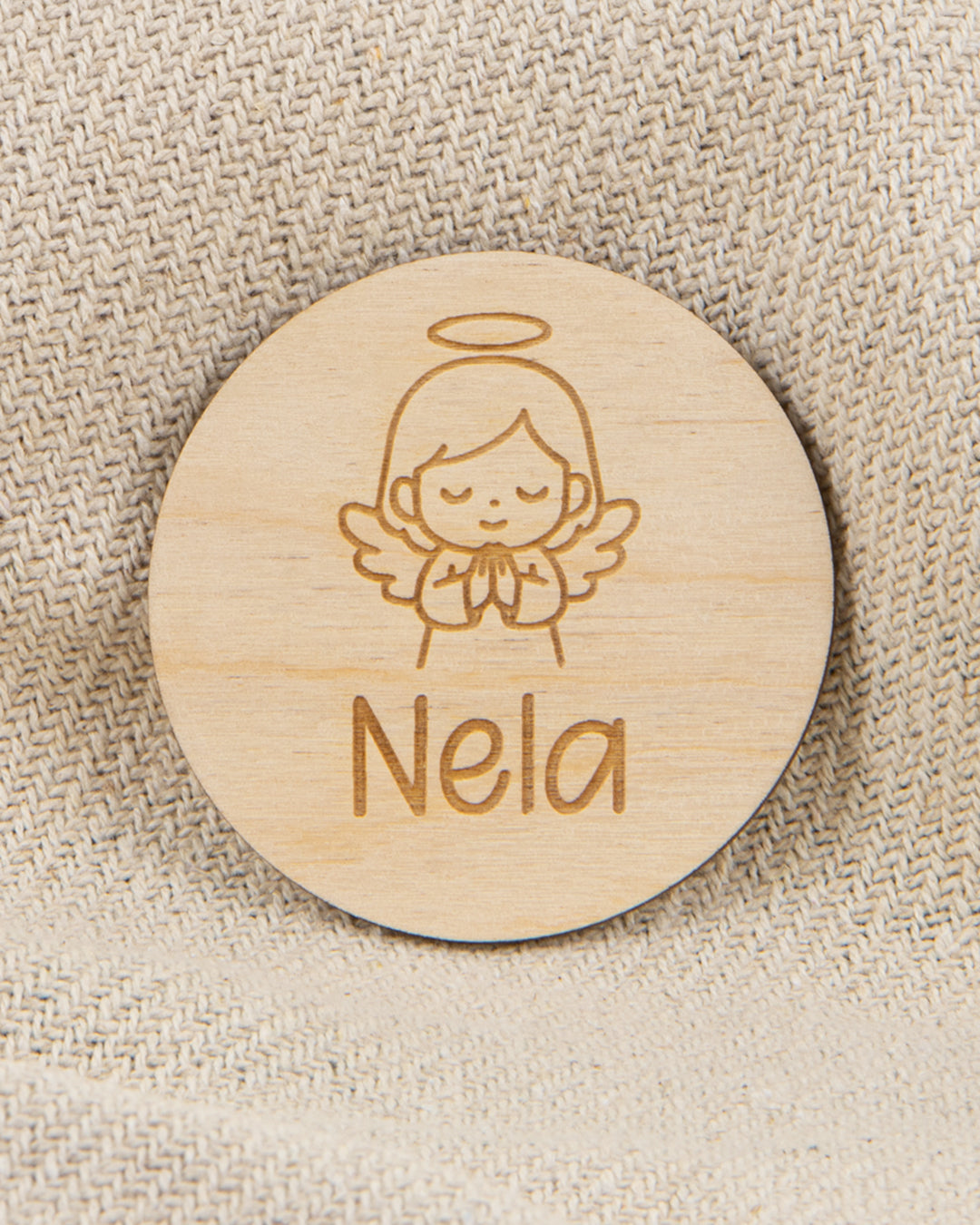 Drveni magnet Anđeo s graviranim imenom djeteta dolazi u ukrasnoj vrećici i savršen je poklon za goste povodom krštenja, prve pričesti ili krizme.