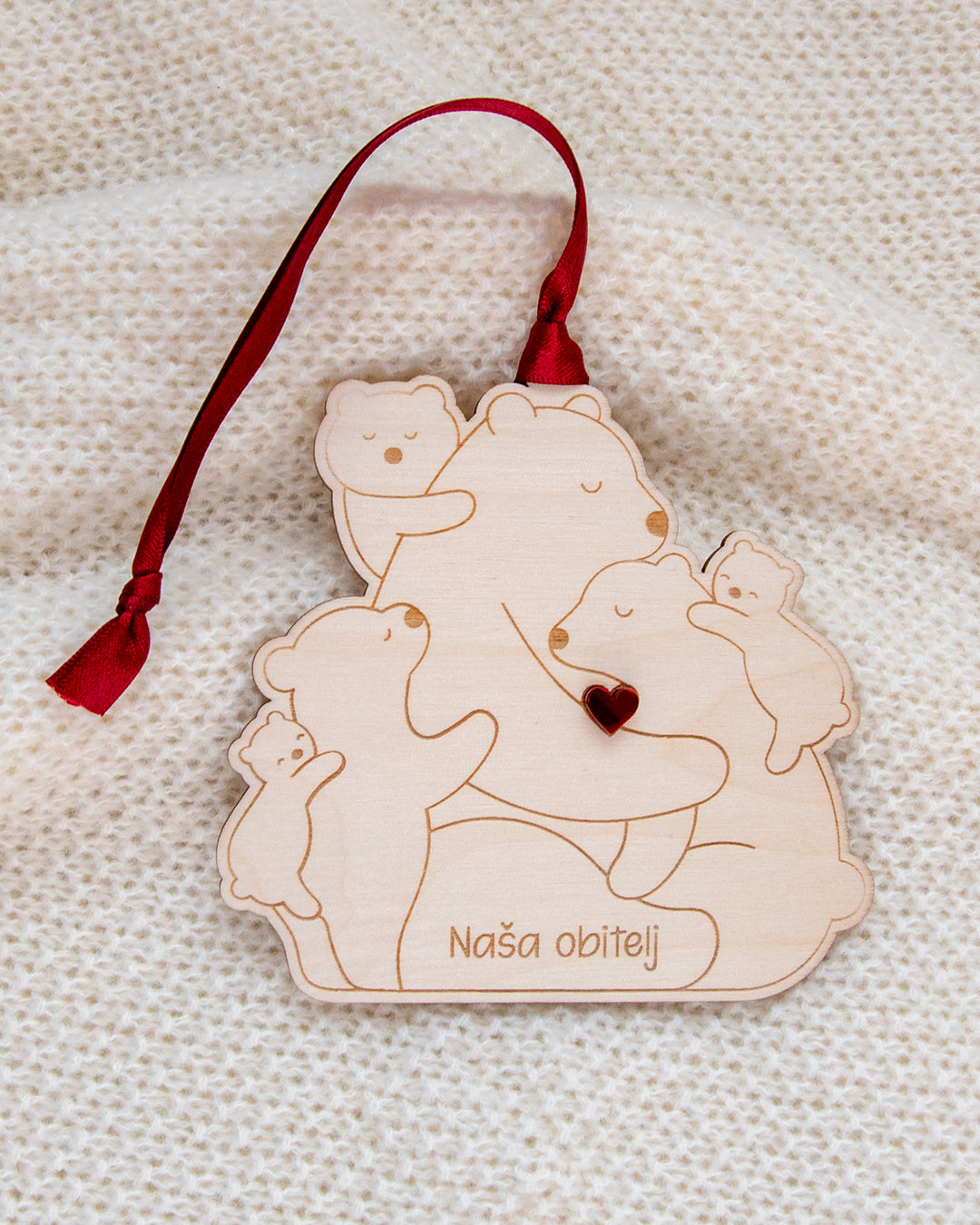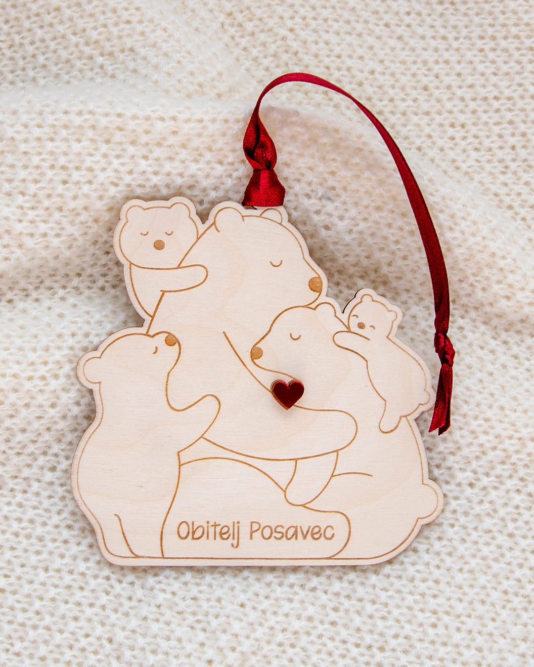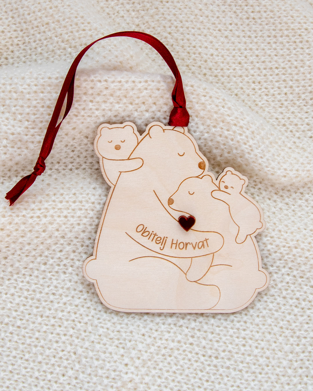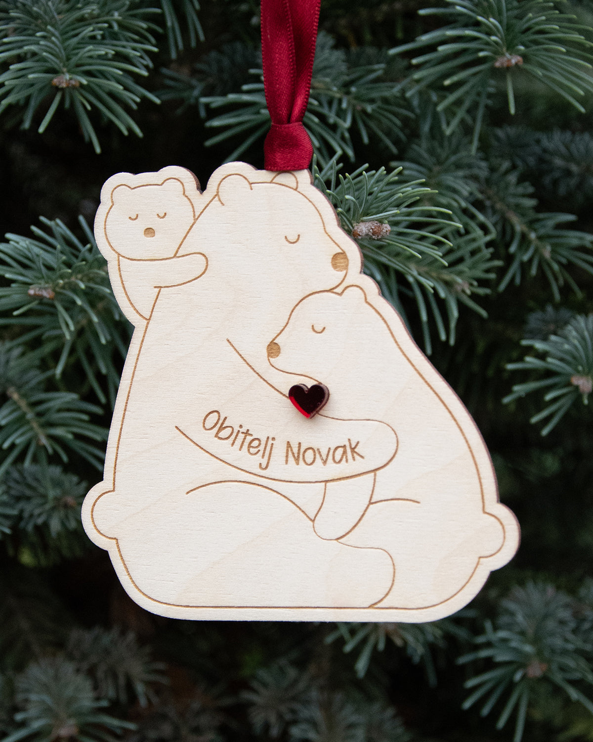 Drveni ukras Medvjedići savršen je kao dekoracija za božićno drvce ili kao poklon obitelji. Moguće je birati koliko će djece (medvjedića) biti na ukrasu uz roditelje. Također, možete odabrati opciju bez ili s personaliziranim graviranim natpisom.