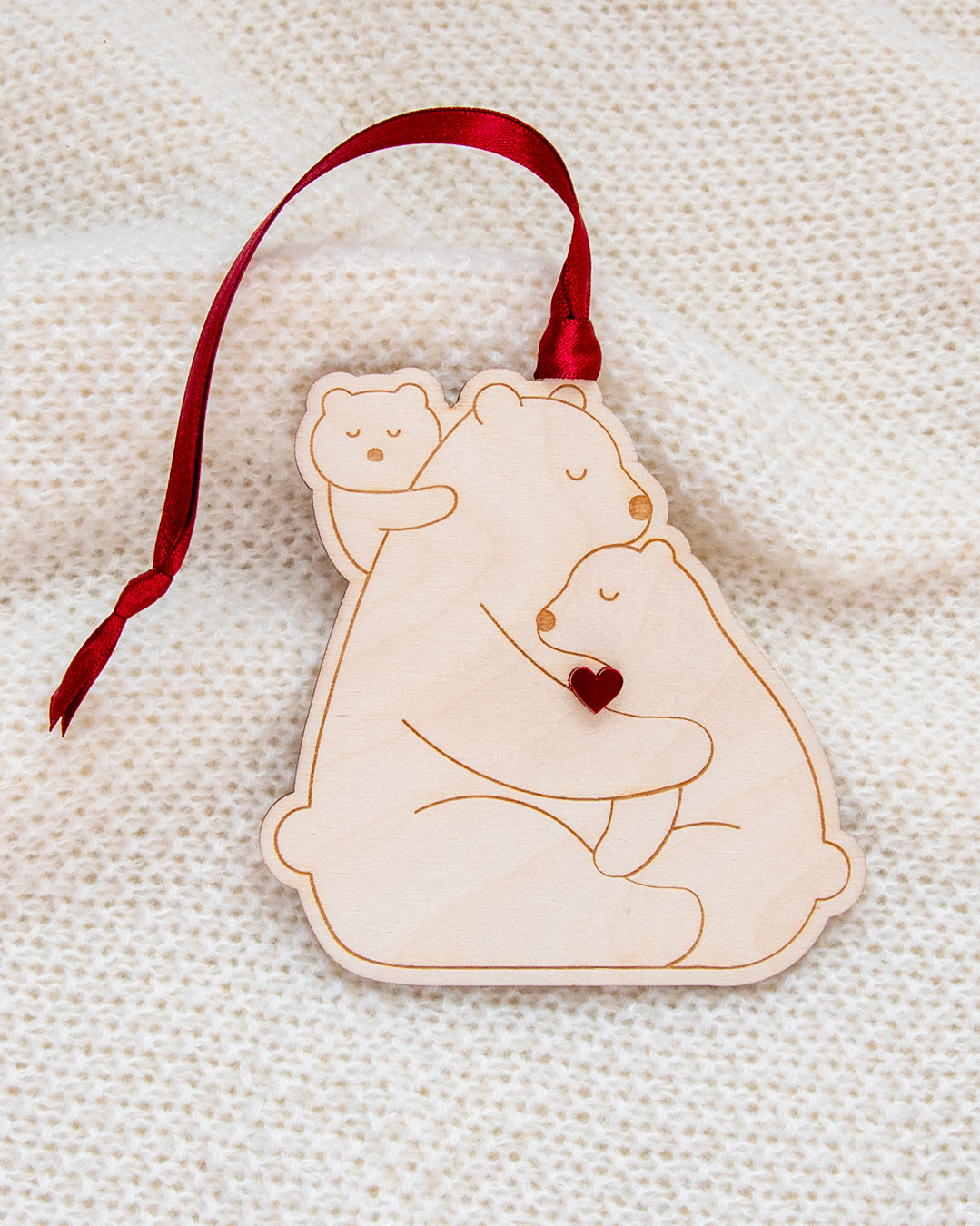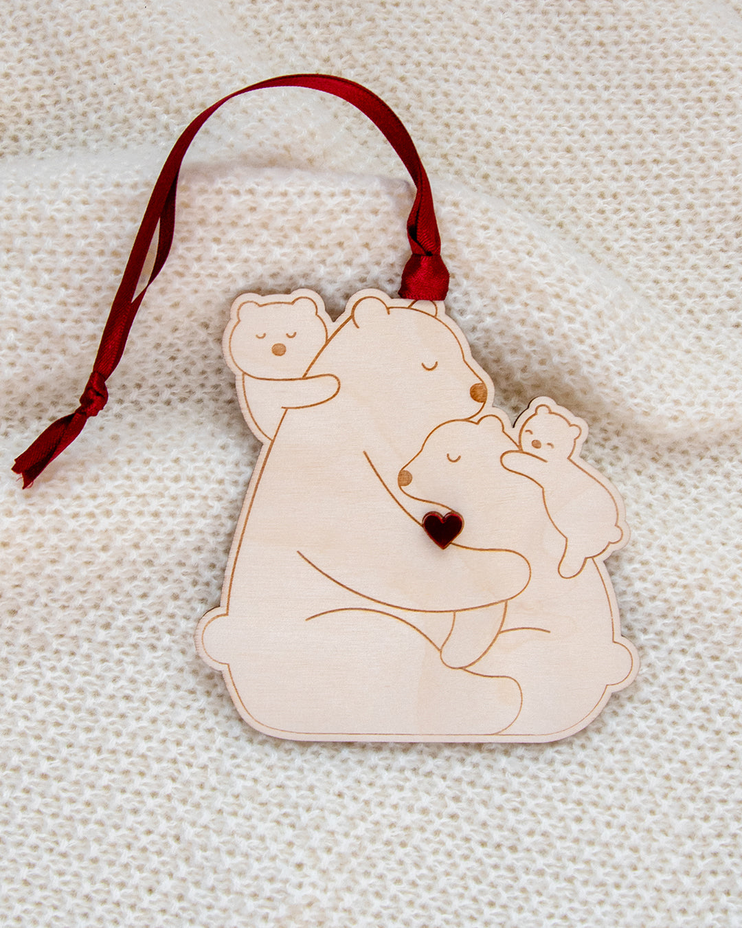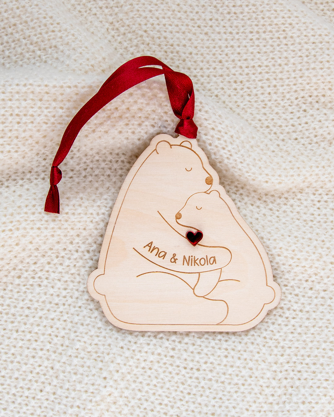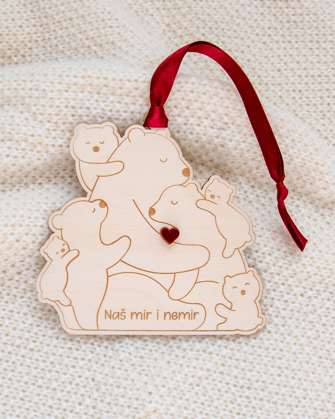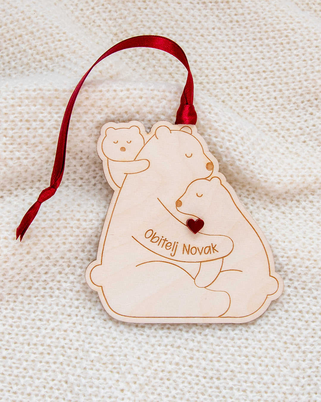 Drveni ukras Medvjedići savršen je kao dekoracija za božićno drvce ili kao poklon obitelji. Moguće je birati koliko će djece (medvjedića) biti na ukrasu uz roditelje. Također, možete odabrati opciju bez ili s personaliziranim graviranim natpisom.
