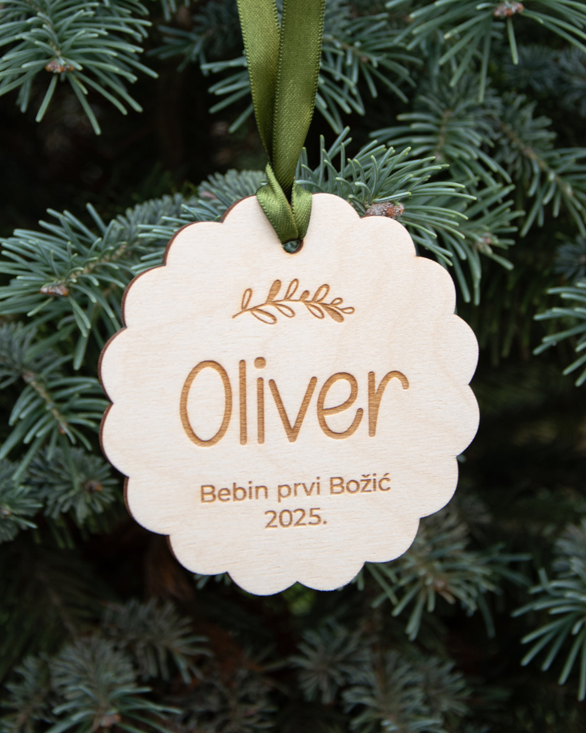 Drveni ukras Prvi Božić sadrži gravirano ime bebe i čini uspomenu na njezin prvi blagdan. Savršen je kao dekoracija za božićno drvce ili kao poklon za roditelje.